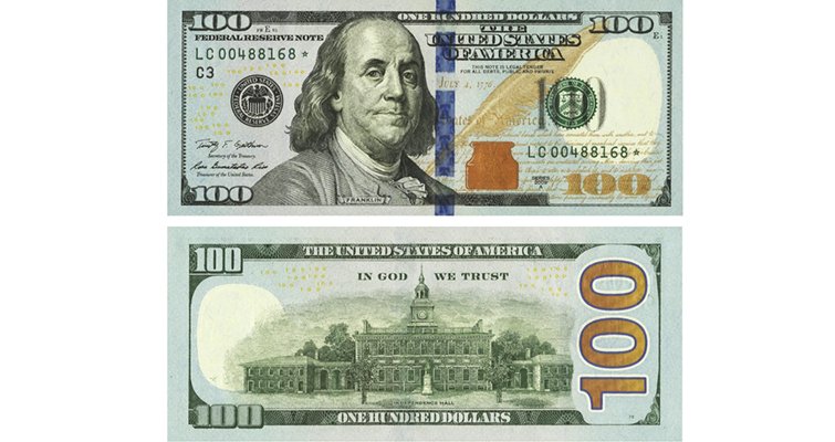 US currency features distinctive security elements including 3D security ribbons on $100 bills, color-shifting